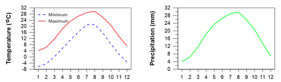 Mean monthly maximum temperature, minimum temperature, and precipitation in the study area.