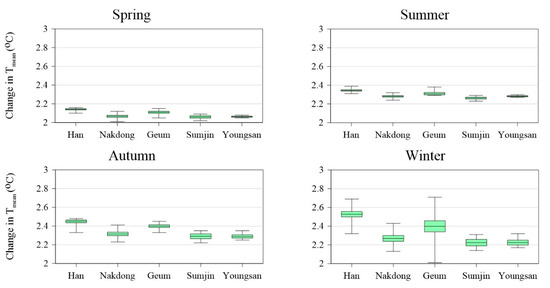 Variation in temperature patterns caused by climate change could impact the temporal and spatial distribution of water resources [39]. The absolute changes in seasonal mean temperature of the future period compared to that of the historical periods for the five major river basins are shown in Figure 4. In fact, this figure shows the increase in mean seasonal temperature for all subbasins (26 subbasins for the Han, 33 subbasins for the Nakdong, 21 subbasins for the Geum, 15 subbasins for the Sumjin, and 14 subbasins for the Youngsan River basins) with respect to the reference period. The results showed that all basins during all seasons are expected to exhibit increased mean temperature by the impact of climate change. In addition, the higher increase in mean temperature is projected for autumn and winter compared to that of spring and summer. Moreover, the Han and Geum River basins revealed higher increases in mean seasonal temperature than that of the other basins.