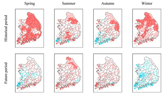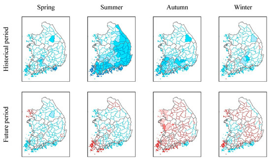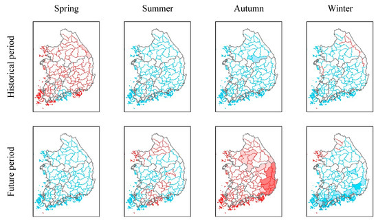 The MK test was performed to detect the significant seasonal trends in water cycle components to understand how the trends in water cycle components changed during the historical period (1976–2005) and how they are projected to change during the future period (2071 to 2099) by the impact of climate change. The analysis was performed for all 109 subbasins of the Korean river basins. The results are shown in Figure 3, Figure 4, Figure 5, Figure 6 and Figure 7.