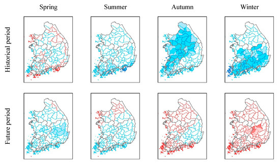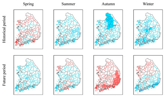 The spatial distribution of the MK test for the seasonal precipitation trends in the historical and future periods are shown in Figure 5. The results of the trend test for the historical period revealed an increasing trend in precipitation during the spring with a significant increasing trend on the eastern coast. Other seasons showed a decreasing trend in precipitation with a significant decreasing trend for the two subbasins of the Han River during the autumn season. However, a different pattern is projected for the trend in precipitation for the future period. Opposite trends in precipitation are projected for spring and all basins affected by the overall decreasing trend in precipitation. During summer, both increasing and decreasing trends are projected, while autumn showed an increasing trend with a significant increasing trend in the eastern subbasins of Nakdong and the central basin of the Han River. Winter showed the same decreasing trend in precipitation with significant decreasing trends in the southern parts.