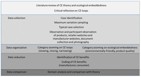 The methodology employed was that of a qualitative comparative multiple case study for producing analytical generalizations [38]. This methodology has been used to address sustainability issues of firms [39]. Case studies are appropriate when there are clearly identifiable cases with boundaries and the research seeks to compare these cases [40]. Maximum variation sampling was used as an exploratory sampling strategy to identify the typical cases. Category zooming [41] focused on particular single aspects of the qualitative data corresponding to the theory of CE loops and ecological embeddedness presented in the previous section. The data were approached conventionally in three stages: organizing, reducing, and comparing [42], as shown in the overview of methodology in Figure 1.