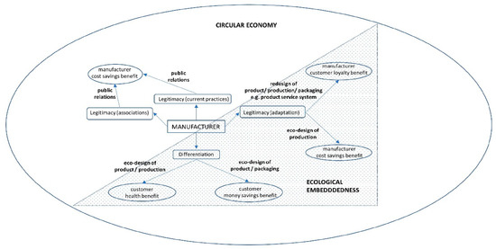 In Table 1, a summary of benefits for the strategies of CE and ecological embeddedness is presented based on Section 2.1, Section 2.2 and Section 2.3. Ecological embeddedness concerns the relations between economic actors (producer and consumer—in this case, more specifically the manufacturer and consumer) and the environment (the underlying ecology of production). Other beneficiaries may be more appropriately considered under forms of social embeddedness.