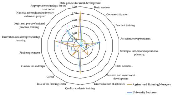 The 18 categorized variables are reflected in the radial diagram in Figure 1. The ULs and APMs research groups were in agreement on 14 of the variables, of which five had values higher than 1.00 (1.00–2.62) and nine variables had values lower than 1.00 (0.23–0.98) (see Appendix C). The five categorized variables with the highest scores were: (1) “State policies for rural development” (academia/state/rural sector), (2) “Quality academic training” (academia/state), (3) “Innovation and entrepreneurship training” (academia), (4) “National research and university extension program” (academia/state), and (5) “Associative cooperativism” (rural sector). Although the two groups (ULs and APMs) agreed on the importance of these variables (areas), they did not agree on the priority of each of these. For instance, the ULs research group in the variable “Quality academic training” presented a centrality value of 1.91, while APMs research group reported a greater centrality value of 2.28.