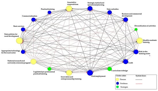 Following the methodology presented by Hernández et al. [34], the information from the 38 interview recordings was transcribed individually in Word format and analyzed in two phases: In the first phase, the concepts were identified based on the transcription obtained using Excel worksheets, taking into account the six topics from the interview script. A total of 117 variables were obtained (Appendix B). In the second phase, the variables were categorized based on the similarity of the topics, and then causal relationships were established. As a result, 18 categorized variables were obtained, which based on the perceptions of those interviewed, were organized into: Problems and strategies, with the responsibility of being served by academia, the state, and the rural sector itself (cooperation, private companies, and the population who live there), as shown in Table 1 (see Appendix A for the definition of categorized variables). It is essential to mention the categorization process was discussed among authors to establish a collective agreement from different branches of expertise.