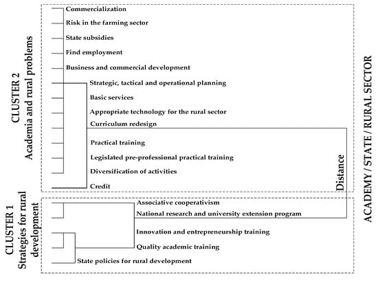 The four most frequent variables reflect the most frequently mentioned categorized variables in both research groups and are related to: “State policies for rural development” (academia/state/rural sector) and “Quality academic training” (academia/state). It is clear that both research groups agree on the importance of these themes, which involve academia, the state, and the rural sector; however, they do not agree on the exact level of importance, which suggests that the groups have different priorities.