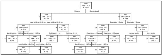 Fixed factors are those which could not be altered by the farmer within reasonable limits of time, capacity and resources, e.g., landholding or years of age and/or practice. Regression tree analysis of the fixed factors showed that farming practices were the main factor explaining the yield variation. Organic farming practices were related to lower yield than conventional farming practices (Figure 1, node 1a v 1b). Organic farms with a landholding size of more than 2.83 ha of a single soil type tend to produce higher yields compared to those with more than one type of soil (Figure 1, node 5b v 5a). Smaller organic farms, i.e., with a landholding size of less than 2.83 ha (Figure 1, node 2a) could be further subdivided into three groups based upon landholding as a factor inflicting the cotton yield. Organic farms with landholdings less than 1.42 ha (Figure 1, node 4a) had higher yields, followed by landholdings between 2.43 and 2.83 ha (Figure 1, node 8b), and the lowest yield was from the farms with landholdings between 1.42 and 2.43 ha (Figure 1, node 8a). Contrary to organic farms, landholding was not the main factor related to yields on conventional farms. Conventional farmers with a formal education of above 5 years and living in a joint family had highest cotton yield (Figure 1, node 7b). Experience in farming was the main factor for the farmers who had less than 5 years of formal education: farmers having ≥ 10 years of experience with landholdings of ≥1.42 ha had the lowest yield on conventional farms (Figure 1, node 9a).