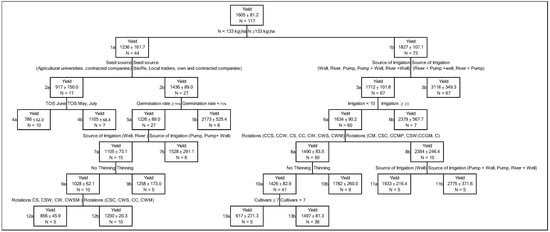 Regression tree depicting the variation in seed cotton yield from different farms, as influenced by management factors (including irrigation, rotations, number of cultivars, seed source, time of sowing, seed rate, seeds per hole, thinning practice, germination rate, nitrogen inputs, method of irrigation, and number and source of irrigations).