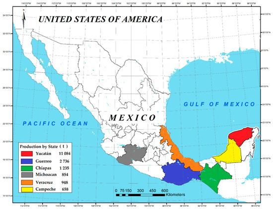 In Mexico, production has been concentrated since 2006, mainly in the states of Yucatan and Guerrero, but the states of Chiapas, Michoacan, Veracruz, and Campeche are consolidating their participation in production every year. The trend in the production of Mamey in Mexico has had a greater momentum from 2006 to 2008; after that period of growth, the upward trend has been constant but slow [33]. Figure 1 shows the zapote production in the main states of Mexico.