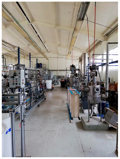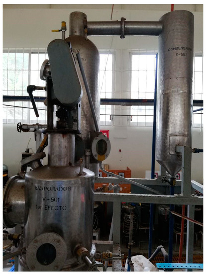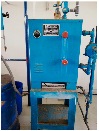 The dimensions of the chemistry laboratory (Figure 3) are 35 × 15 × 3 m, and among the equipment, the laboratory has two evaporators and a reactor for the dehydration of food. These equipment are fed by one 200 kW liquefied petroleum gas (LPG) boiler to produce steam. It consumes 200 L of LPG to produce 400 kg/h of saturated steam. Figure 4 shows the evaporator–condenser assembly.