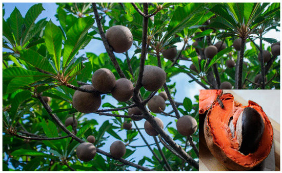 The zapote mamey (Pouteria sapota, also called Lucuma mammosa) is a tree species of the Sapotaceae family. The zapote mamey tree is an ornamental, perennial tree that can reach a height of up to 40 m and a diameter at breast height of more than 1 m. The trunk is straight and may have buttresses. The external bark is cracked and falls off into rectangular pieces, brownish-gray to brownish-black in color, with a thickness of 10 to 20 mm. The leaves are arranged in a spiral and agglomerate at the tips of the branches. The fruits are berries that are up to 20 cm long, ovoid, reddish-brown in color, and rough in texture. The mesocarp is sweet, fleshy, orange to reddish, with small amounts of latex when unripe. It usually contains a seed that is up to 10 cm long, ellipsoid, and black to dark brown. The percentage in weight of the seed ranges from 8% to 16% of the total weight of the fruit [33].