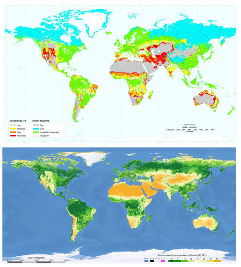 (Upper panel) A global map of land vulnerability to desertification based on climate aridity index (Source: US Department of Agriculture, Natural Resources Conservation Service, Soil Survey division, World Soil Resources, http://commons.wikimedia.org/wiki/Image: Desertification_map.png). (lower panel) A global map of land vulnerability to desertification based on the application of the Environmentally Sensitive Area (ESA) approach considering climate, soil, vegetation and human pressure (8 classes with increasing land vulnerability were shown: N: not affected; P: potentially affected; F1-3: ‘Fragile’ areas; C1-3: ‘Critical’ areas; Source: [91]).