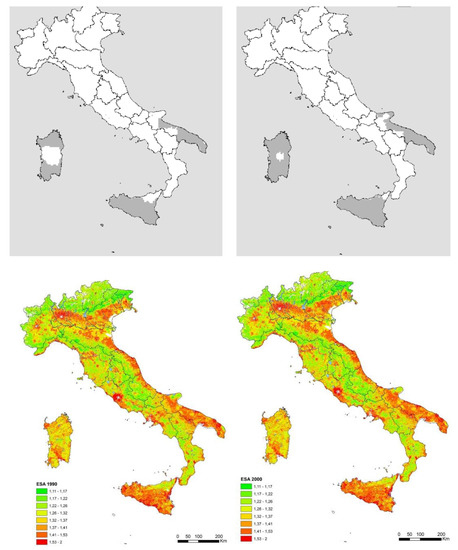 One example was provided by the national action plan to combat drought and desertification in Italy, prepared and approved in 1999, that identified sensitive areas to desertification in the country by using a simplified system of thresholds elaborating the aridity index in agreement with international standards (e.g., United Nations Environmental Program). Comparing environmental conditions in 1990 and 2000, Figure 2 illustrates the spatio-temporal evolution of sensitive lands based on this linear approach in Italy compared with a more complex evaluation of the same concept based on the Environmental Sensitive Area index that integrates three dimensions of climate quality, soil quality and vegetation/land-use quality. Assuming land sensitivity as an eminently dynamic issue, the ESA approach delineates a more articulated spatial pattern of land sensitivity in Italy, going beyond the simplified and partial information derived from analysis of the climate aridity index. When considering changes over time in the studies time interval (1990–2000), the illustrated pattern underlies particularly complex territorial dynamics that should be considered in specific policy approaches.