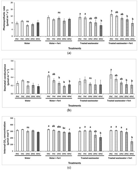 Compost ratios did not affect the tomato plant physiology as leaf photosynthesis (averaged as 7.68 μmol m−2 s−1), leaf stomatal conductance (averaged as 0.23 μmol m−2 s−1), internal CO2 concentration (averaged as 309.63 μmol mol−1), and chlorophyll fluorescence (averaged as 0.72 Fv/Fm) remained at similar levels among the examined compost ratios (0%-5%-10%-20%-40% C) used (Figure 2). This indicates the similar behavior of the crops during cultivation, with no changes in physiological aspects in terms of photosynthetic metabolism. Similar findings were observed in Cichorium spinosum grown in pots with MSW compost of 60 t ha−1, as total chlorophylls were unaffected [59]. Fertigation with tap water in ≥10% C decreased leaf stomatal conductance, while internal CO2 concentration decreased in ≥20% C+Fert. The use of TWW in 40% C decreased (up to 43.1% and 31.2%) photosynthesis and internal CO2 concentration, respectively. The combination of TWW and fertigation also decreased plant physiology attributes with more profound effects in 40% C treatments.