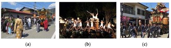 (a) Mikoshi procession; (b) Okoshi-Daiko, and (c) Yatai Parade (Seiryu-tai).
