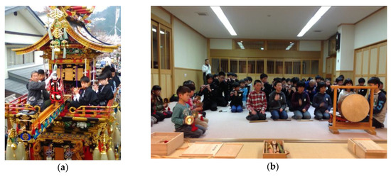 (a) Hayashi learners performing on the Kirin-tai float during the Furukawa festival (photograph captured by Hida City); (b) Hayashi learners of the Seiryu-tai group.