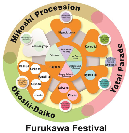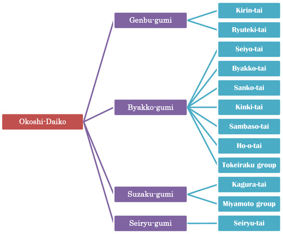 As mentioned in the Introduction, the Furukawa Festival comprises three main events—the Mikoshi procession, Okoshi Daiko, and Yatai Parade—meaning that the festival involves several vertically and horizontally integrated organizations. For instance, the Okoshi Daiko event involves four groups of performers (Seiryu (azure dragon), Byakko (white tiger), Genbu (black tortoise), and Suzaku (vermillion bird)) and 10 Yatai groups, the Tokeiraku Group, and the Miyamoto Group, for a total of 12 organizations. However, the evolution of the local historical culture has affected people’s living environments, leading to a change in population structure. The number of people in the 12 organizations has become imbalanced. Consequently, groups with few members merged into a new group that handles and learns ceremonial affairs together, and the new group is dissolved immediately after the festival, as described by the communities of practice of Wenger [22]. Although temporary groups are formed specifically for the Furukawa Festival, they have a fixed structure, producing another form of cooperation and competition (Figure 6).