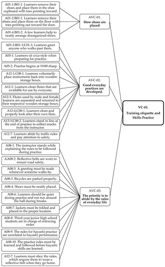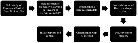 This study was conducted using six years’ worth of field data. The learning of Seiryu-tai Hayashi learners in April 2019 was selected as the case for this study. Observations and interviews were employed in the field study, and tools were used to record audio and video or to take field notes, which were then summarized and organized to produce firsthand information. First, data collected in the field were transcribed verbatim. Second, grounded theory and open coding were employed to conceptualize the transcripts before subcategory classification was performed. Finally, the KJ method was used to group the subcategories into main categories. Subsequently, a tree diagram was produced to establish connections and constructed into a chapter (Figure 4). Problems or new issues were identified during the process, and solutions were obtained by re-entering the field.