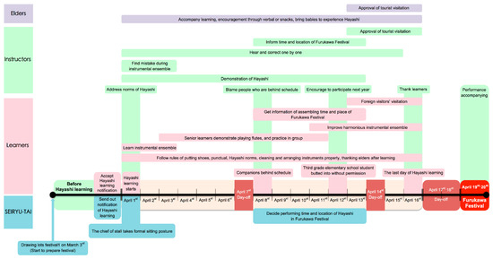 In the Furukawa Festival, the people are the Yatai groups, the events are performances, the time and place are the time and place in which learning and performance occur, and the objects are the tools required during performances. Cooperative learning brings everyone together, including learners, instructors, older adults, infants, and even visitors from Western countries. For Hayashi practice for the Furukawa Festival, everyone gathers together.