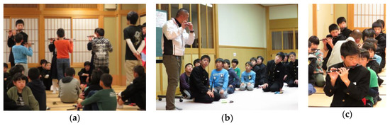 Hayashi is the musical accompaniment provided during various traditional Japanese performances. Hayashi learners typically play flutes and percussion instruments. In the Yatai Parade during the Furukawa Festival, young Hayashi learners ride and perform on nine, Yatai floats: the Seiryu-tai, Kirin-tai, Sanko-tai, Ryuteki-tai, Ho-o-tai, Seiyo-tai, Byakko-tai, Kinki-tai, and Kagura-tai. The Furukawa festival originally had 10 Yatai floats, but one, the Sambaso-tai float, was destroyed in a fire in Furukawa-cho in 1904. There were no Hayashi performers because only large flag floats were used during the Yatai Parade. Hayashi learners are required on the Yatai float in the Yatai Parade; they are also required in the Hayashi and Karakuri marionette performance, in the children’s kabuki performance, and during the lion dance performed by the Miyamoto-group and Kagura-tai. Almost all of the children in Furukawa-cho have participated in one or more Hayashi performances, and members of the Yatai Parade also learn to play musical instruments as Hayashi learners when they grow up. Therefore, we selected Hayashi as the focus of this study (Figure 2).