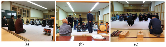 Once the field observations were complete, the events and objects observed and experienced during the fieldwork were processed using language to generate verbal interaction with the subject of the study. Those in key roles are an essential source of information for researchers [20,21]. This study was based on interviews conducted over a period of six years with people who played crucial roles in the village of Furukawa-cho. When a researcher identified a problem when observing the cooperative learning of Seiryu-tai Hayashi learners, the researcher talked to some of the parties involved at random and in a natural environment. People who played major roles in the cooperative learning or who held an abundance of information on the cooperative learning of Hayashi performers were interviewed (Table 2).