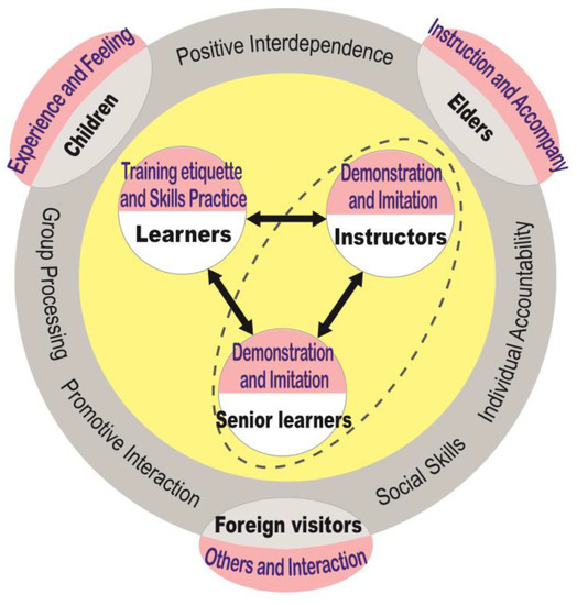 We applied the five elements of cooperative learning introduced by Johnson and Johnson [7] to analyze the process of Seiryu-tai’s cooperative Hayashi learning. The results are as follows: (1) Cultivation and skills: to follow the norms of Hayashi learning and then cultivate skills; (2) Demonstration and imitation: the process of Hayashi learning without notation; (3) Instruction and accompanying: elders addressed norms and demonstrated skills, provided comfort and encouragement; (4) Experience and feeling: interacting with unqualified learners to allow them to experience Hayashi atmosphere, and (5) Others and interaction: experience interactions with different cultures.