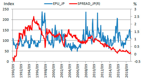 Because the BOJ has launched the longest history of easing monetary policies since 1990s, we obtain monthly data from Bloomberg, during the period from September 1990 to October 2019, almost 30 years. The dependent variable, treasury yield spread, is defined as the difference between the on-the-run government bonds for which maturity is 10 years and two years; data on this variable were obtained from Bloomberg. The independent variable, the Japanese economic policy uncertainty (EPU) index, is based on the information obtained from leading newspapers and was constructed by Baker et al. [7].