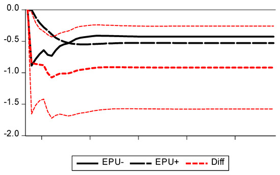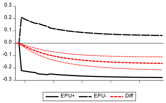 Because a long-run equilibrium nexus exists among the three variables, we specifically examine the results where long- or short-run asymmetric characteristics exist from Equation (8) adopting the Wald tests for both the long- () and short-run (). The result of the dynamic multipliers is presented in Table 6. Looking at the lowest AIC of the four models, model 4 (AIC = 0.9494), where the long and short runs are both asymmetric, is the model with the best fit, and using the Wald test at a 10% significance level, the estimated results clearly confirm the coefficients of the spread. Additionally, from Figure 4, we confirm the existence of overall asymmetry between treasury yield spread and EPU. Furthermore, as seen from Figure 4, the Japanese EPU decrease is significant in the whole sample period. Therefore, we will now look at the dynamic multiplier of the EPU decrease on the yield spread.