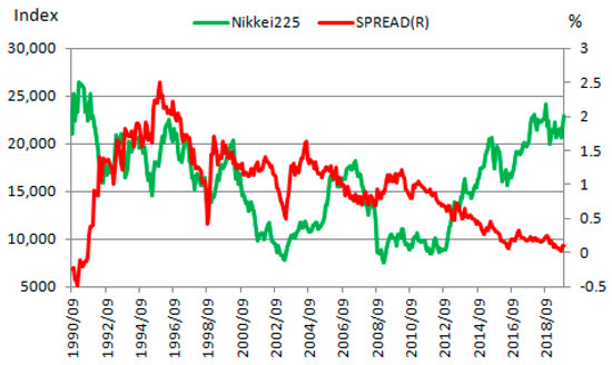 We adopt the Nikkei 225 index as the proxy of Stock Purchasing Plan because Nikkei 225 has the longest launching history, and is the representative of the stock market in Japan. As seen in Table 1 and Table 4, the rate of return of the Nikki 225 is less volatile than economic policy uncertainty, and due to the long-run easing of monetary policy and high demand for treasury, the yield spread is the most stable. The Jarque–Bera test results shown in Table 4 reveal that the Nikkei 225 rate of return does not follow normal distribution. As shown in Figure 3, since the Asia Financial Crisis in 1997, the BOJ’s long-term expanding monetary policy has caused the yield spread decreasing afterwards. Meanwhile, unconventional monetary policy has supported Japanese stock markets for several decades.