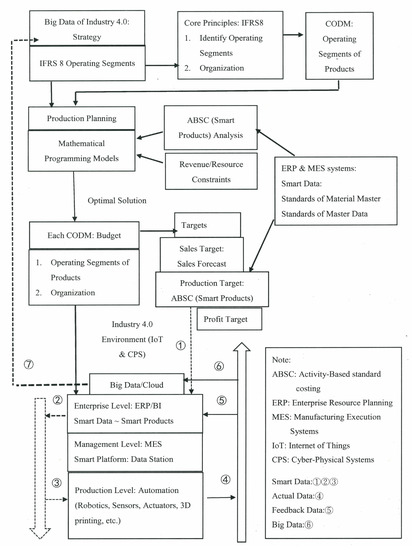 This paper creates a smart operating roadmap that contains the entire process of a strategic business plan integrating functions, methods, and tools [1]. The modern accounting rules of the International Financial Reporting Standards (IFRS) support the global accounting framework and the governance principles companies [2]. The Chief Operating Decision Makers (CODM) follow the core principles of the IFRS 8 operating segments to plan the product-operating segments as a strategic functional principle [1,3] for a group. The Activity-Based Standard Costing (ABSC) production decision model is to realize the method of maximizing profit by determining the best optimal solution, which can also meet the strategic function of product-operating segments [4]. However, information technology in the age of Industry 4.0 suggests how to use system tools to expand the process of a strategic business plan, which is an important issue for all international enterprises [5,6]. Presently, using the best solution for the LINGO system as a budget plan can ideally systematize the plan data in smart Enterprise Resource Planning (ERP) system operation [1,7]. On the other hand, as a powerful Manufacturing Execution System (MES) in Industry 4.0, it provides the information hubs for smart factories, and integrates multiple vertical and horizontal IT systems [8]. The MES functions include: Online connectivity to the operational automation level and planning data, consistent data exchange, comprehensive self-optimizing systems, etc. [8,9]. Admittedly, in the operational process, the data of the ABSC module in the smart ERP system will be applied to the integrated MES [4]. The aim is to execute timely operational management, control, communication, and analysis to achieve the goal of Industry 4.0 [1,10].