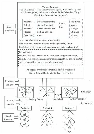 Lastly, from the standard cost point of view of each smart product, the establishment of standard costs can usually be divided into direct materials, direct labor, and manufacturing overhead, which must also be divided into direct standard costs and indirect standard costs. The standard cost function can be a management tool for predetermining costs, including future cost, expected cost, and forecasting cost for planning a profit plan period or a business’ operating budget [8,40,44]. Further, analyzing quantity or price variances during actual operations is different between standard and actual costs, and the results of cost differences can be improved in the operating process to achieve accurate smart data and operational budgets. The key factor for each smart product is smart data, which implements our various smart products by standardizing a variety of quantities from direct resource to activity [27,40]. From an organizational point of view, each smart product must also automatically record related information about the manufacturing department, region, and product number during operation [6]. A simple ABSC model is shown in Figure 2.