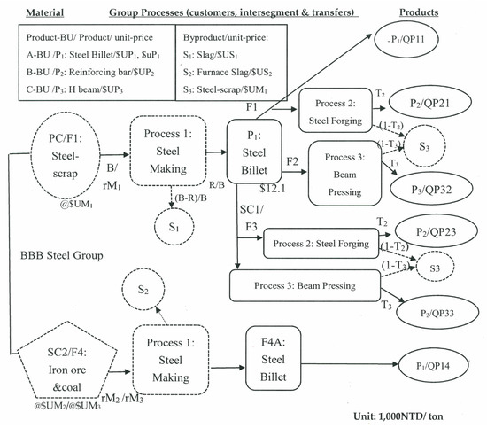 Figure 4 shows a description of the manufacturing processes for an international steel group. This study includes various discussions: Firstly, designing and following the IFRS 8 operating segments plan regarding the manufacturing relationship of all factories and processes in a steel group [3,46]. Secondly, following the revenue’s definition of IFRS 8 standards, the revenue of a business group includes external customers, the intersegment sales of different company, and transfers of the same company [3]. Thirdly, comparing process 1 in steel making, different materials and manufacturing methods have different cost elements and output. Lastly, three different kinds of byproducts are output in different processes.