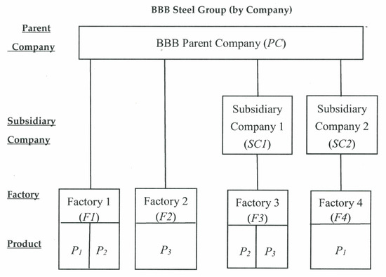 The flowchart in Figure 4 describes a steel group’s processes from material to products (the quantities of each product equal the sales forecast). The study integrates all resources and production processes of the steel group to maximize profits. Adapting the mathematical programming method will achieve optimal decision-making by using a LINGO system [4,33]. This study contributes a group of multiple Product-BUs organization [2,3], which not only follows IFRS 8 standards, it also extends the ABSC model of a group, which will achieve smart manufacturing through various systems, ERP and MES systems [4,37].