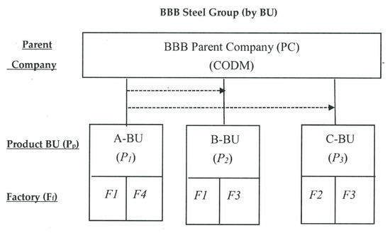 In this case, following the two core principles of IFRS 8 (as in Figure 1) and designed in an ERP system [36], we completed the BBB group’s organizational structures as the corporate group and BU group, as shown in Figure 7 and Figure 8, respectively. Next, from an internal management point of view, the complete financial statements will follow Figure 7 and Figure 8, which not only divides each company into different BU (for example, Table 4), it also consolidates the BU of different companies in the BBB group (as shown in Section 1).