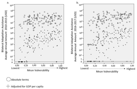 Scatterplots showing the relationship between countries’ mean vulnerability and average annual amounts of bilateral adaptation assistance allocated by all sources globally in both absolute terms and adjusted for GDP per capita and for two time frames: (a) 2010–2015 corresponding to pre-Paris Agreement and (b) 2016–2017 corresponding to post- Paris Agreement.