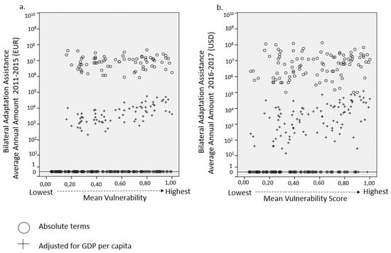 Scatterplots showing the relationship between countries’ mean vulnerability and average annual amounts of bilateral adaptation assistance allocated by Germany in both absolute terms and adjusted for GDP per capita and for two time frames: (a) 2011–2015 corresponding to pre-Paris Agreement and (b) 2016–2017 corresponding to post- Paris Agreement.