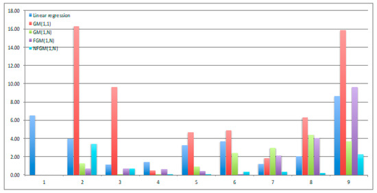 To compare the modeling and prediction accuracy, a numerical example from Zeng’s [43] work is used to verify the validation of the proposed NFGM(1,N) model. The system characteristics behavior sequence is X1(0) = (11.4918, 12.2255, 13.3201, 14.5930, 17.3891, 21.0232, 26.4446, 23.5325, 46.5982), and the relevant factor sequence is X2(0) = (2.6487, 3.7183, 5.4817, 8.3891, 13.1825, 21.0855, 34.1155, 55.5982, 91.0171). The backward data in the sequence represent the newer information. The first eight data are used for model fitting, and the ninth datum is used for ex-post testing. The econometric model, including the autoregressive moving average (ARMA) model and the linear regression model, GM(1,1), GM(1,N), FGM(1,N), and NFGM(1,N) models are applied to the numerical example. However, because the system characteristics behavior sequence fails to pass unit root test, which means that the data is nonstationary, the sequence cannot be regressed by the ARMA model. The prediction results of the remaining models are shown in Table 1. The MAPEs of the linear regression, GM(1,1), GM(1,N), FGM(1,N), and NFGM(1,N) models in relation to model fitting are 2.91%, 5.51%, 1.51%, 1.10%, and 0.64%, respectively. The MAPEs of the ex-post testing are 8.63%, 15.87%, 3.67%, 9.60%, and 2.24%, respectively. As can be seen from Table 1, the prediction accuracy of the NFGM(1,N) model is much better than that of the other models, whether for model fitting or ex-post testing. Figure 1 shows the superiority of the prediction accuracy of the proposed NFGM(1,N) model over the linear regression model, GM(1,1), GM(1,N), and FGM(1,N) models. Therefore, the proposed NFGM(1,N) model performs well in this numerical example compared with the other models.