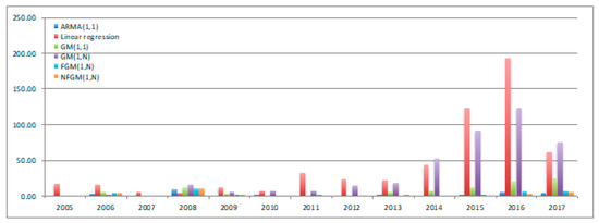 where the optimal fractional orders for the CO2e and OFDI, and the optimal value of the power are 0.01, 0.3, and 0.91, respectively. The values of the fractional order indicate that giving greater weight to new information improves prediction accuracy, which is also consistent with the principle of new information priority. As explained by Wu et al. [17] and Ding et al. [4], the driving coefficient bi can be used to interpret the relationship between the system characteristic behavior and relevant factors. In this study, the driving coefficient is b2 = 1.04 × 10−4, which indicates that there is a positive relationship between the CO2e and OFDI. In other words, the CO2e increase with increasing OFDI. To examine the prediction accuracy of the proposed NFGM(1,N) model, this model is compared with the ARMA model, linear regression model, GM(1,1), GM(1,N), and FGM(1,N) models. The actual and predicted values of the five competing models are displayed in Table 3. Table 3 shows that the MAPEs of the ARMA model, linear regression model, GM(1,1), GM(1,N), FGM(1,N), and NFGM(1,N) models for model fitting are 2.08%, 18.18%, 3.57%, 12.47%, 2.20%, and 2.16%, respectively. The MAPEs in relation to ex-post testing are 4.32%, 126.04%, 19.41%, 96.75%, 5.22%, and 3.06%, respectively. Thus, although the prediction accuracy of the NFGM(1,N) model is slightly inferior to that of the ARMA model for model fitting, the prediction accuracy of NFGM(1,N) is much better than that of the other competing models for ex-post testing.