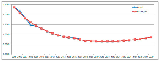 The above results confirm that the proposed NFGM(1,N) model has good practicability, and it can better predict China’s CO2e by considering the effect of OFDI than the other models. Therefore, it has been applied to forecast the CO2e from 2018 to 2030. The predicted amount of OFDI from 2018 to 2030 is generated by the GM(1,1) model. The predicted value of the relevant factor from 2018 to 2030 is then substituted into the NFGM(1,N) model, which thereby enables China’s CO2e predictions, after considering the effect of OFDI, to be obtained correspondingly. The predicted OFDI and CO2e are shown in Table 4. It is noteworthy that China’s carbon emissions will decrease initially, and then climb. Additionally, the prediction of China’s CO2e in 2020 and 2030 are 0.64 and 0.85, respectively, which represent reductions of 72.83% and 63.97%, respectively, compared with that of 2005. The calculation results show that through unremitting efforts, China can fulfill the CO2e reduction commitments.