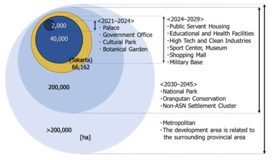 Figure 2 shows the urban plan and time schedule of NCC development in Indonesia [4]. Indonesia aims to build a core area of 2000 ha for the presidential palace and the three branches—judicial, administrative, and legislative—by 2024. It plans to begin using the NCC as the capital city as soon as possible. The majority of functions and facilities will be developed by 2029 and contained within 40,000 ha, which is smaller than the current capital city, Jakarta, whose area is 66,162 ha [31]. The metropolitan area of the NCC will be expanded by around 200,000 ha, which will include a national park and orangutan conservation center.
