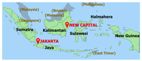 The Indonesian government declared that it would relocate the nation’s capital city from Jakarta to East Kalimantan on August 16, 2019 [1]; however, only the government and the administrative sector would be relocated, keeping Jakarta as the economic center of Indonesia [2]. There are five reasons why this relocation should be beneficial for Jakarta, namely, (1) it will ease the heavy traffic congestion; (2) it will help slow down environmental degradation such as air and water pollution, (3) it will help make Jakarta less vulnerable to natural disaster risks such as earthquakes and/or tsunamis, volcanos, and floods; (4) it will mitigate the levels of economic and population concentration; and (5) it will relieve land subsidence caused by the pumping of groundwater [3,4]. The as-yet-unnamed new capital city (NCC) in East Kalimantan, unlike Jakarta, is located in the geographical center of Indonesia, which is expected to enhance the national motto Bhinneka Tunggal Ika, or unity in diversity, with its 300 ethnic groups; it would also reduce the likelihood of severe impacts from natural disasters compared to most areas in Indonesia [5].