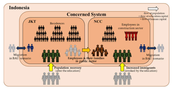 This paper considers two study areas, namely, Jakarta and the NCC, as the concerned system analyzed in this paper. The relocation will trigger migration not only from Jakarta to the NCC, but also from outside to inside the concerned system. This paper defines migration from outside the system to Jakarta as population recovery in Jakarta, and from outside to the NCC as increased immigration into the NCC (Figure 4).