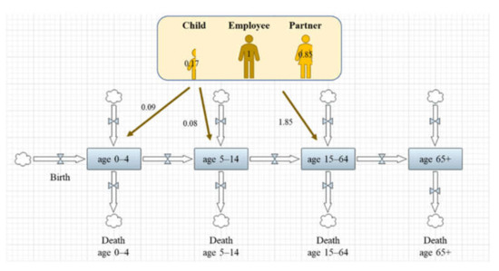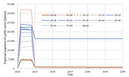 Figure 6 illustrates the concept of the migration model for public sector employees, and Table 3 and Figure 7 show the results. The result of population prediction in Jakarta and the NCC, depending on the age groups, can be seen in the Appendix A (Figure A1 and Figure A2).