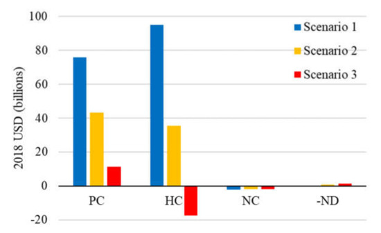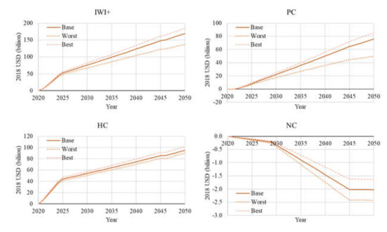 For the sensitivity analysis, best and worst case scenarios are employed. In the best case, all factors are adjusted to push IWI+ up; for instance, emission factors are multiplied by 1.05 in Jakarta and 0.95 in the NCC because Jakarta gains benefits from a reduction in emissions and the NCC suffers the reverse effect. In contrast, all factors are adjusted to make IWI+ worse. For population, the opposed treatment of emission factors is conducted. Figure 8 shows the test results of IWI+, PC, HC, and NC in Scenario 1. Although the base scenarios of HC and NC are centralized between their best and worst scenarios, this is not true in PC, because of the adjustment of its depreciation rate. In the best case scenario, the depreciation rate is 4%, the same as the base scenario referred to in IWR 2014 [14] and IWR 2018 [15]. On the other hand, the rate of the worst case is 7%, the same as IWR 2012 [13]. As shown in Figure 8, the depreciation of PC in the worst case scenario is larger than the others, which indicates the importance of the operation and management of PC to decrease its depreciation. The sensitivity of NC is larger than others, which is caused by the adjustment of the deforestation rate. The Indonesian government expects the deforestation rate in the NCC to be 50% [4]. This paper considers it to be 40% in the best case scenario and 60% in the worst case scenario. Hence, the NC loss sensitively corresponds to the deforestation amounts.