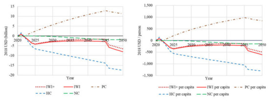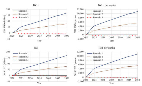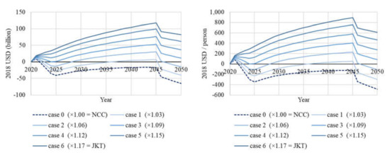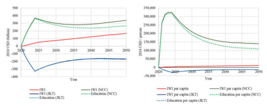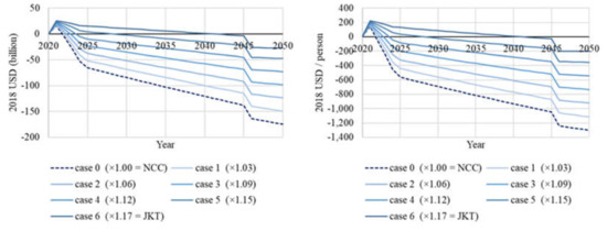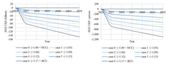 Regarding IWI+, four cases (Case 3 to Case 6) have a positive value in 2050; however, there is no case with a trending monotonic increase after 2045, which means the sustainability of IWI cannot be guaranteed in the long run. Long-term sustainability is only possible after 2045, when the income level in the NCC exceeds that in Jakarta. In other words, additional investment is required to secure the sustainability of IW. The situation of IWI+ per capita is the same as that of IWI; although five cases (Case 3 to Case 6) have positive values throughout the simulation period, no case ensures sustainability after 2045.