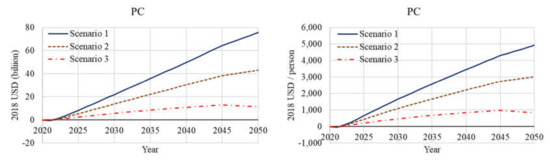 Figure 11 shows the change in gross PC and PC per capita in each scenario. Scenario 3 has the highest value of PC. The value of change in the PC stock of Scenario 1 in 2050 is 75.8 billion USD, while the CR of Scenario 1 is 43.82%; that of Scenario 2 is 43.2 billion USD, while the CR is 52.95%; and that of Scenario 3 is 17.45 billion USD, while the CR is 35.07% (Figure 12). This is because a larger population entails greater household spending, which generates investment through increased GDP. Although a larger population leads to an increase in congestion, emissions, and natural disaster risk, population growth brings overall benefits to PC. The trend’s turning point will occur in 2045, at the time when the capital city development is completed and the depreciation of the infrastructure starts to stand out. Since the best and worst scenario tests in Section 3.1 show that PC sensitively responds to the depreciation rate, better management and continuous investment are necessary in order to maintain the sustainability of PC after 2045.