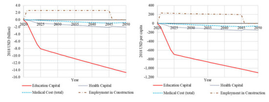 With respect to HC and HC per capita, the decline after 2045 is inevitable once temporary employment in the construction sector diminishes as the development project is completed. Although the monotonic decreases get worse even after 2045, no case has a monotonic increase trend or positive value in 2050.