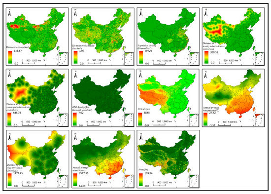 The coordinate data of the build-up areas for various kinds of administrative centers were acquired by the Application Program Interface (API) from the Baidu Map. The original data were all vector point data. Since the data of the Baidu Map follow the coordinate system defined by Baidu itself, the obtained data should be processed by coordinate conversion. Subsequently, distance factors could be generated in ArcGIS by using the coordinate data of administrative centers. All the above data were processed into 1000 × 1000 m grid data. The geographical coordinate system was WGS-84, and the projection coordinate system was Albers_Conic_Equal_Area.