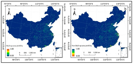 Suitability probability of built-up and non-built-up areas. Notes: The suitability probability ranges from 0 to 1. A larger value indicates a higher probability of becoming urban areas (a) or non-urban areas (b).