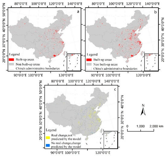 (a) China’s urban built-up areas in 2017; (b) simulation results of built-up areas in China in 2017; (c) error check.