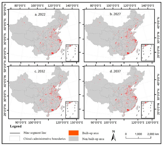 Simulation results of urban sprawl in China in (a) 2022; (b) 2027; (c) 2032, and (d) 2037.